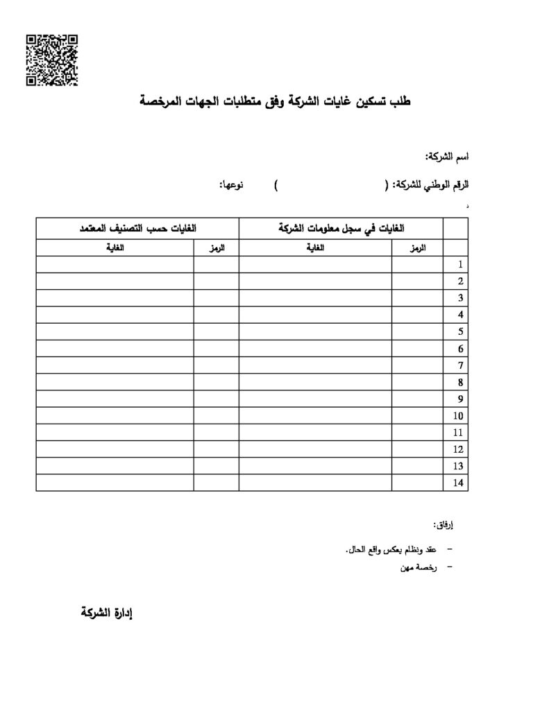 نعم، إذا كانت الشركة تمارس أكثر من نشاط فعلي، يمكن تسكين كل غاية بالرمز المناسب لها. - ما أهم سبب لرفض الطلب؟
